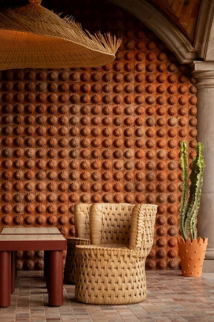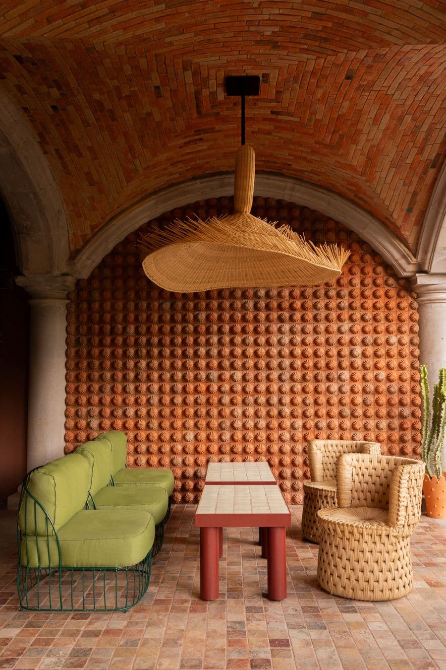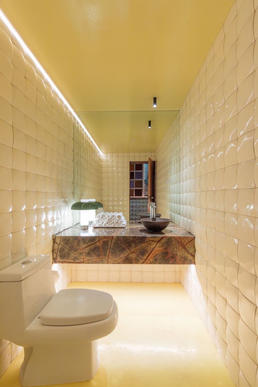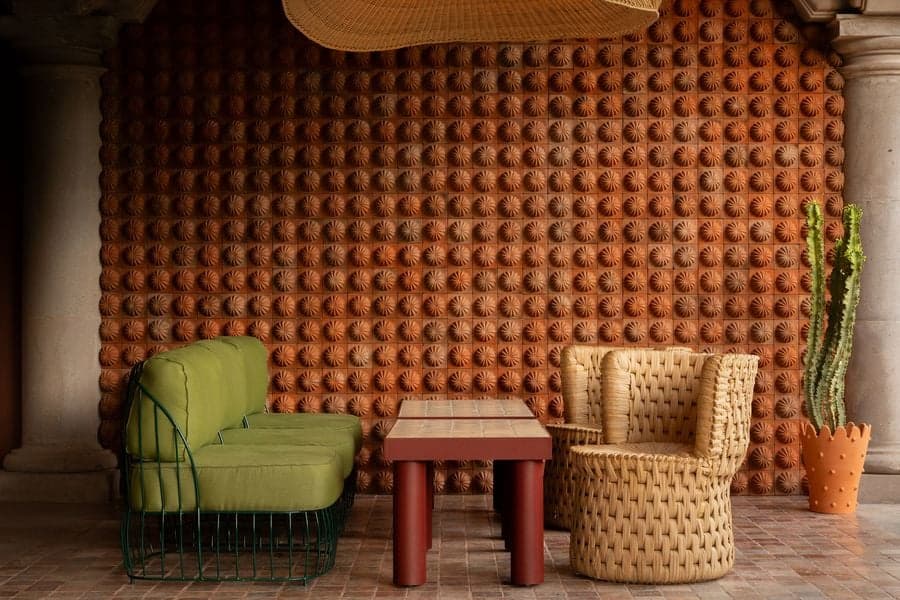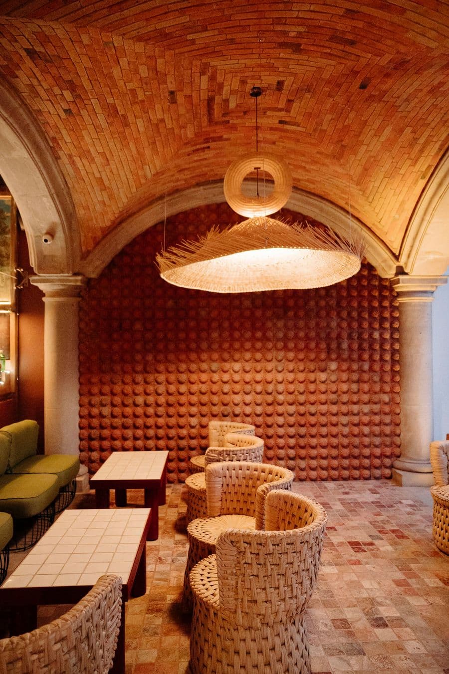 故事在露台上延續,Mestiz 的超大手工編織柳條吊燈熠熠生輝Los Patrones的黃綠色沙發、SÁASIL的手工編織薄​​紗椅以及 MAYE 的瓷磚桌面餐桌,共同構成了一幅輕鬆愉悅的景象。就連浴室也體現了設計的妙趣:浴室內鋪設著由當地製造商 MARO 打造的絎縫效果白色瓷磚,宛如一個充滿軟墊的房間,帶來意想不到的觸覺驚喜。