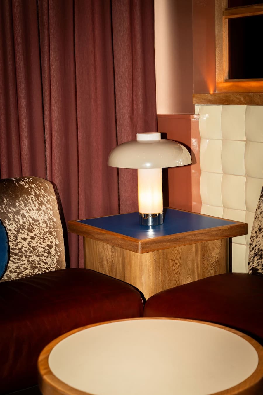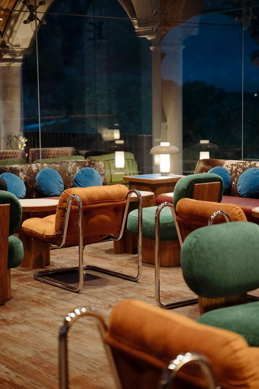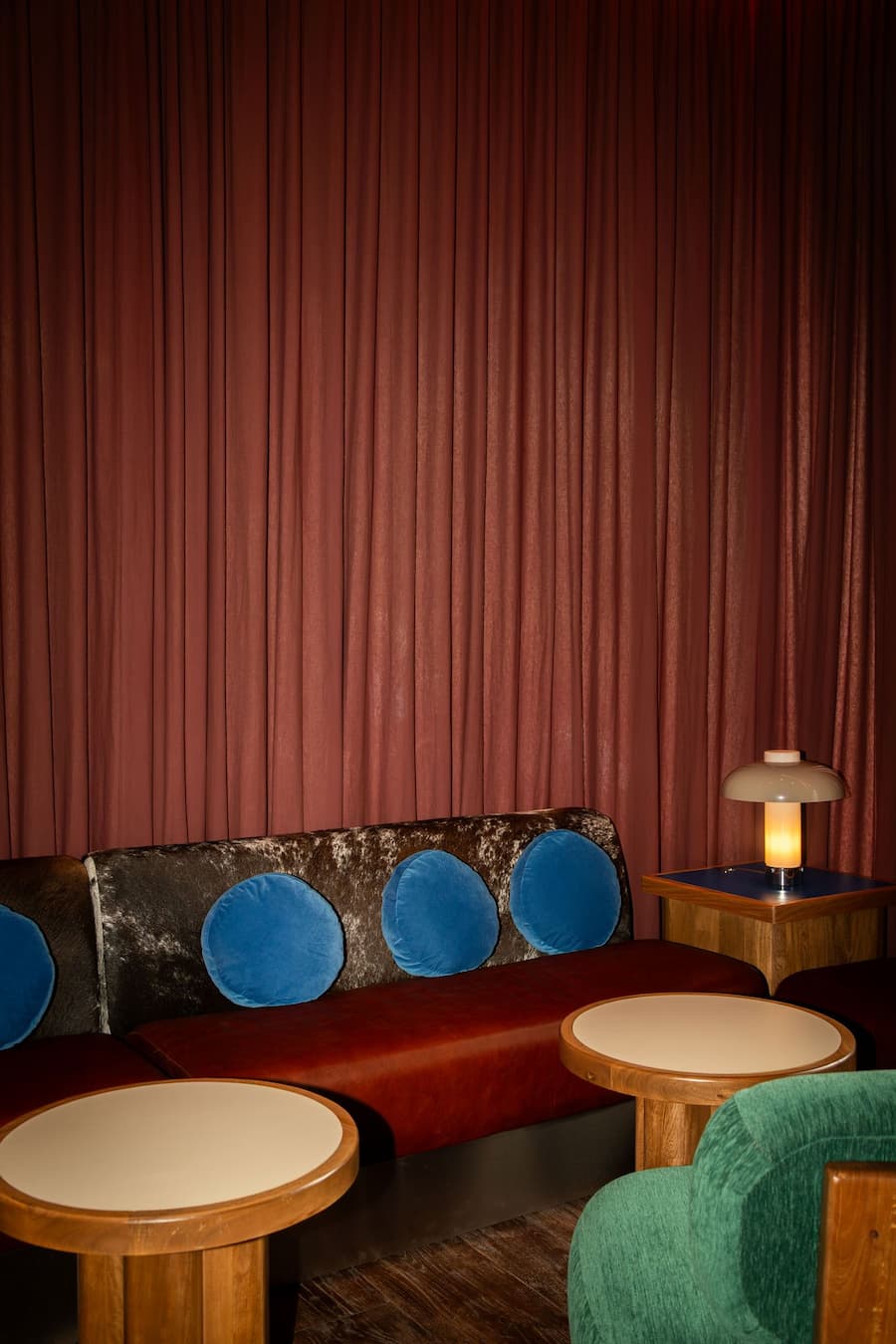 酒吧美學的配色方案最能言善辯:煙草棕、赭石色和奶油色調讓人聯想到曬乾的木材、做舊的皮革和陳年的梅斯卡爾酒,而植物綠和閃爍的克萊因藍則點綴其中,形成鮮明的對比。鍍鉻細節巧妙地向乳製品行業致敬,以現代視角重塑鄉村風情,威士忌和蜂蜜色調的彩色玻璃隔間讓房間沐浴在柔和的棕褐色光芒中。為了緩和兩側寬闊的拱形開口,Ruiz 引入了深紅色的薄紗窗簾,拉上窗簾後,空間充滿了戲劇性的親密感。牆上鋪著立體赤陶瓷磚,增添了觸覺深度與傳統感,數位化的精準度與手工技藝的融合,體現了酒吧美學在傳統與現代之間的對話。