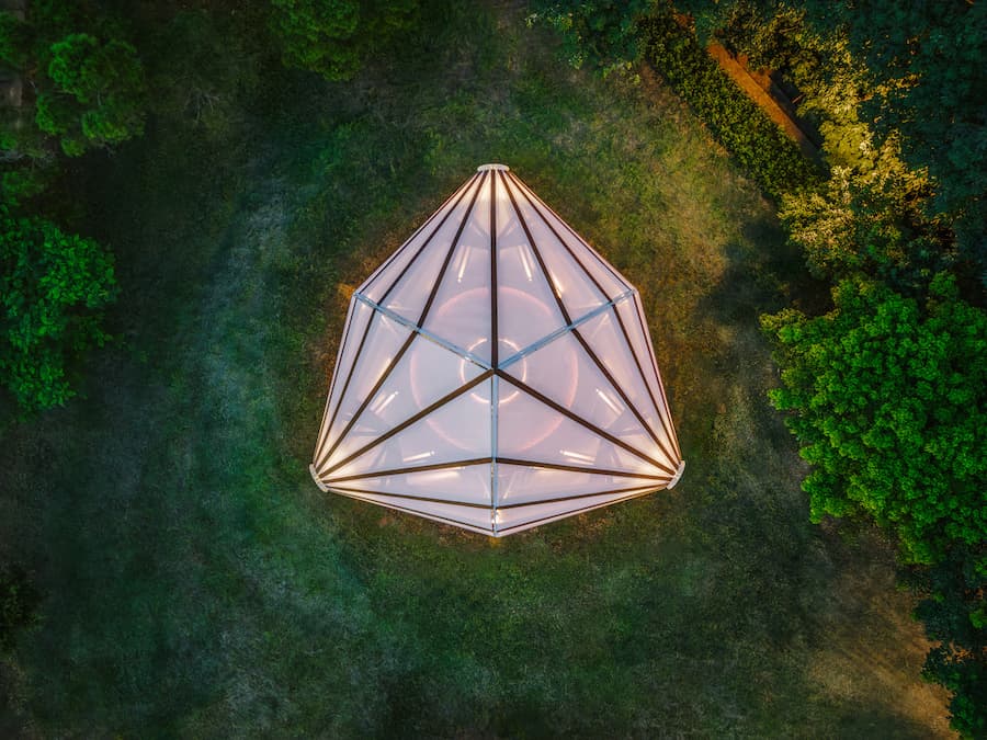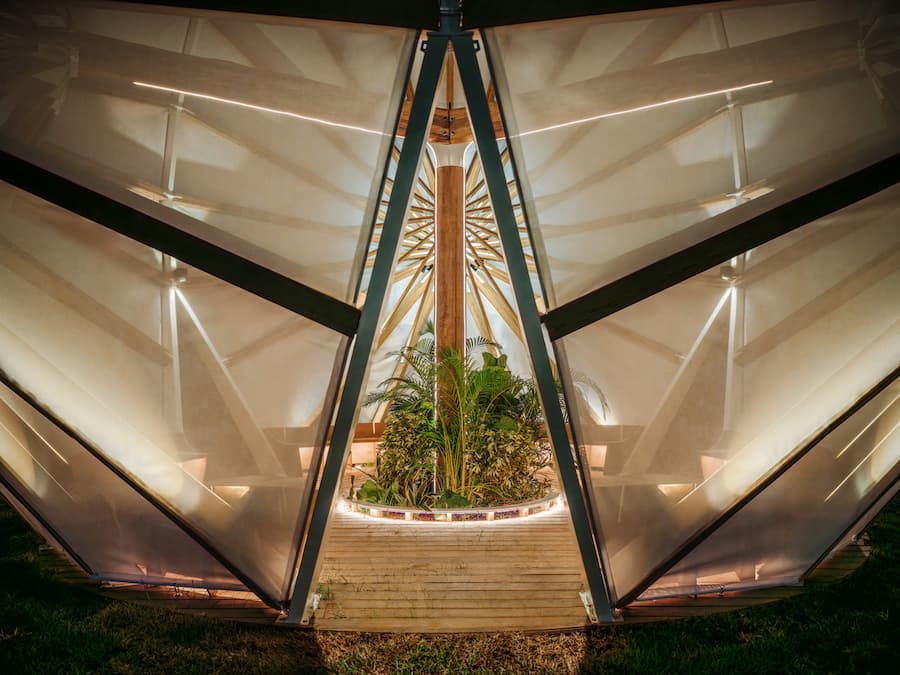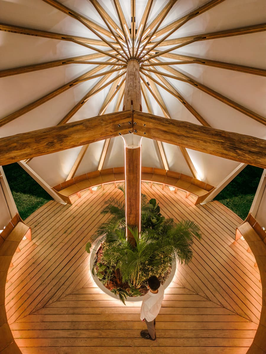 圍繞著中央的袖珍花園,木質圓形長椅提供了休憩的空間,在人與自然生長之間營造出平衡。頂篷採用穿孔帆布製成:白天,它沐浴在陽光和空氣中;夜晚,它像燈籠一樣發出柔和的光芒;雨中,其傾斜的表面自然地將雨水導走,既保留了遮陽傘的日常功能,又在建築尺度上將其放大。