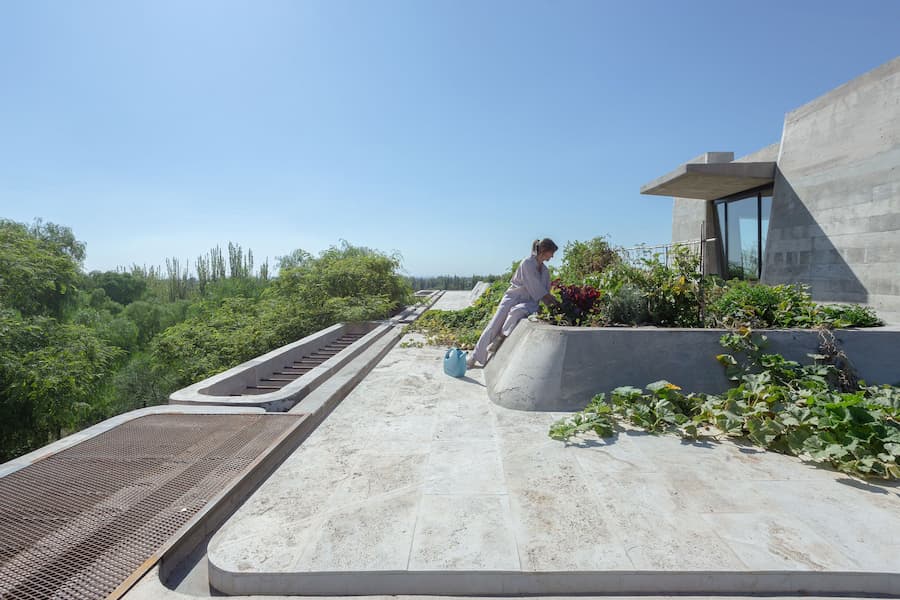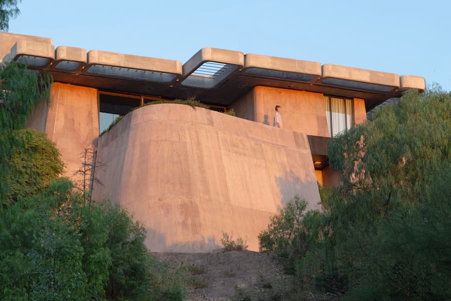 房屋坐落在山坡上,俯瞰安第斯沙漠山脈和下方的綠洲,其對場地的巧妙處理令人嘆為觀止。施工期間未移除任何一棵樹,而經過細緻現場測試研發的土色混凝土與周圍的岩石地形完美融合。建築本身彷彿從山坡上有機地拔地而起,同時又彰顯出一種全新而獨特的建築特徵,設計團隊稱之為「抽象自然」。其多邊形基座、傾斜的牆面和圓潤的轉角順應地形起伏,令人聯想到堡壘的防禦幾何形狀,但又被重新構想成既充滿未來感又充滿原始氣息的建築。