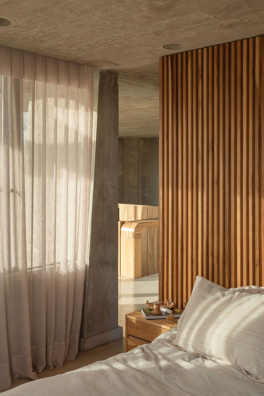 室內,「粗野主義的誠實」概念延續至今,裸露的混凝土表面、雕塑般的現澆體塊與內置家具相得益彰。天然木質覆層帶來溫暖,包覆樓梯和牆面,柔化了材質的色調,同時強化了與大自然的連結。公共區域的水磨石地板營造出連續性,斑駁的表面為室內空間營造出觸感上的寧靜。設計秉承極簡主義的美學理念,透過寬闊的玻璃窗框住沙漠山脈的景緻,向周圍的景觀致敬,讓光影在一天中為室內增添活力。最終呈現的是一個平衡簡樸與私密的家,其冥想特質既體現在它的隱含中,也體現在它的展現中。