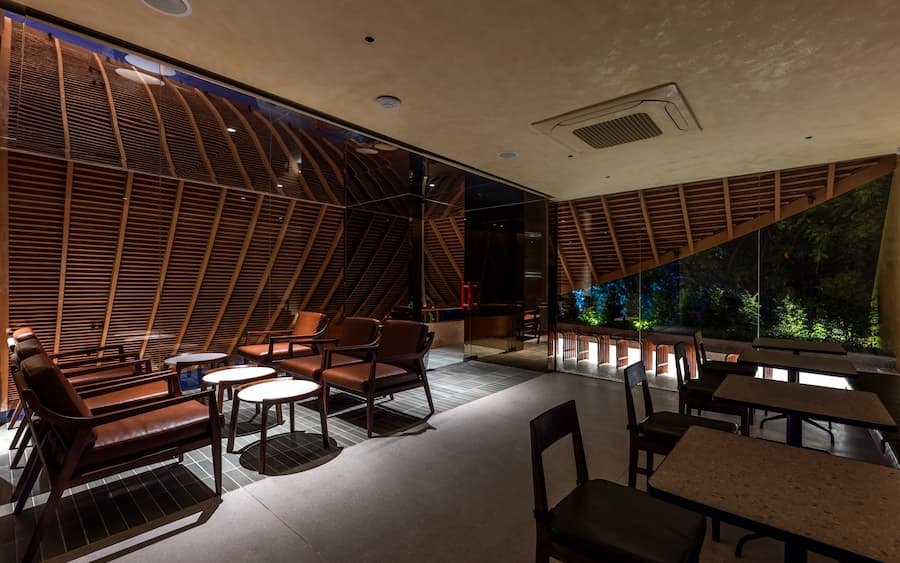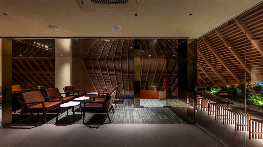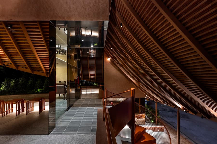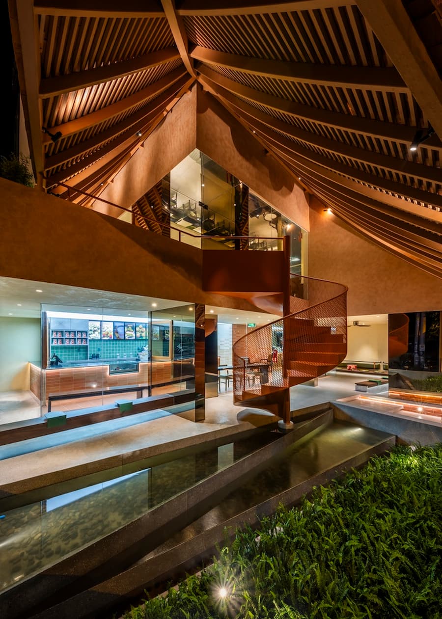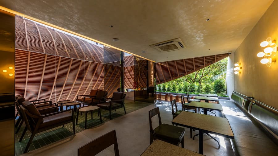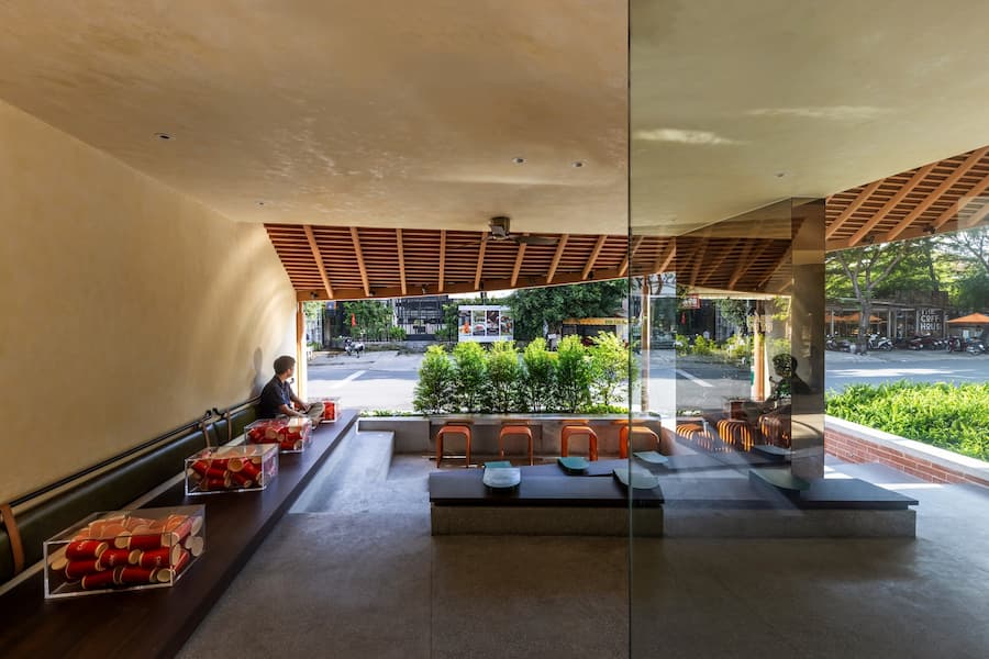 最引人注目的是其寬闊的屋頂,其設計靈感源自越南傳統建築。屋頂優雅地彎曲,在十字路口拐角處向外延伸,不僅成為建築的焦點,也連接著室內外空間,吸引人們的目光,並促進與街景的互動。屋頂也與二樓相連,形成了一個通風良好的陽台,為賓客提供靈活、清新的體驗。這項設計不僅是對傳統形式的象徵性致敬,更體現了創新和更深層的文化探索。因此,遮陽陽台、波光粼粼的水面和低矮的座椅等元素的融入,喚起了一種懷舊之情,並為訪客營造出溫暖、熱情的氛圍。
