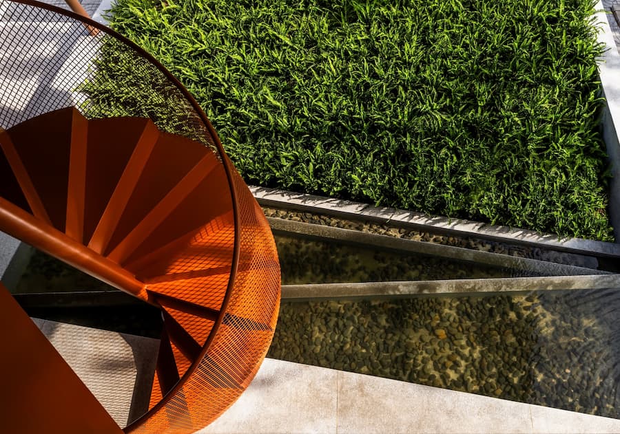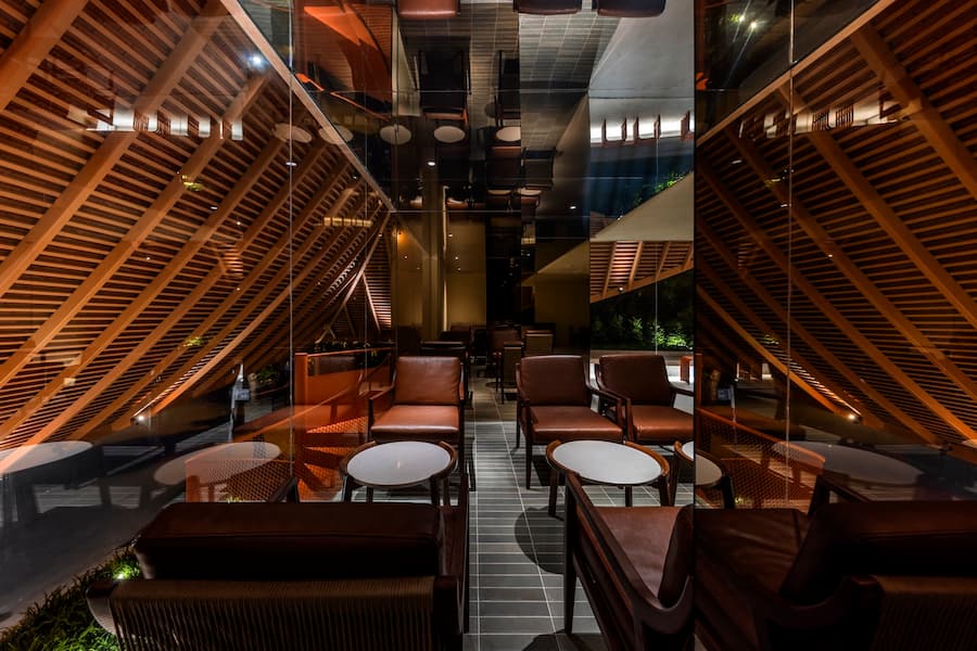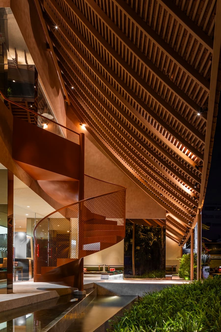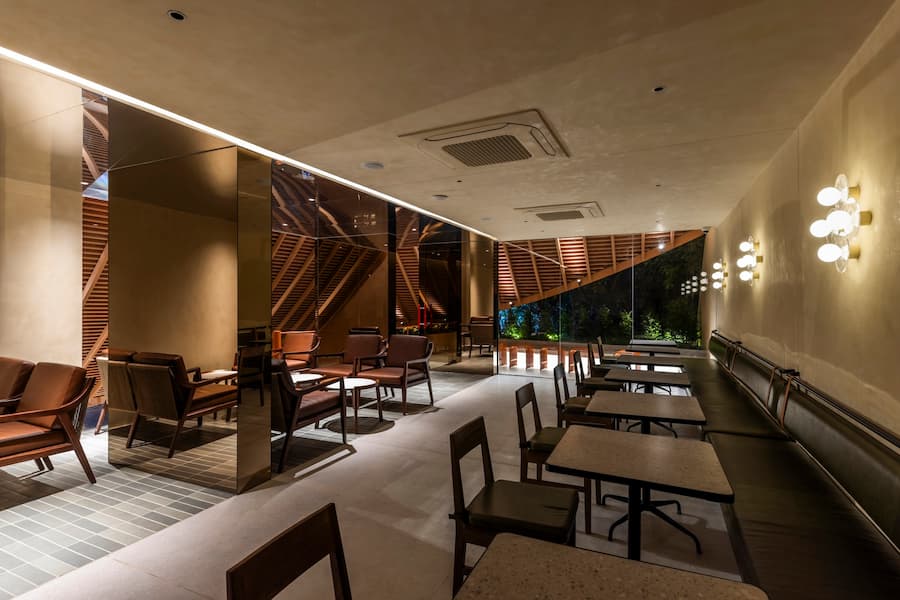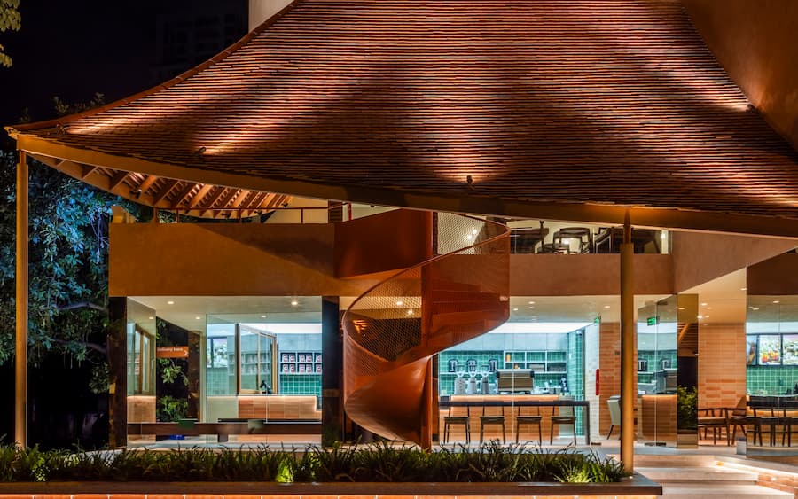 最引人注目的是其寬闊的屋頂,其設計靈感源自越南傳統建築。屋頂優雅地彎曲,在十字路口拐角處向外延伸,不僅成為建築的焦點,也連接著室內外空間,吸引人們的目光,並促進與街景的互動。屋頂也與二樓相連,形成了一個通風良好的陽台,為賓客提供靈活、清新的體驗。這項設計不僅是對傳統形式的象徵性致敬,更體現了創新和更深層的文化探索。因此,遮陽陽台、波光粼粼的水面和低矮的座椅等元素的融入,喚起了一種懷舊之情,並為訪客營造出溫暖、熱情的氛圍。