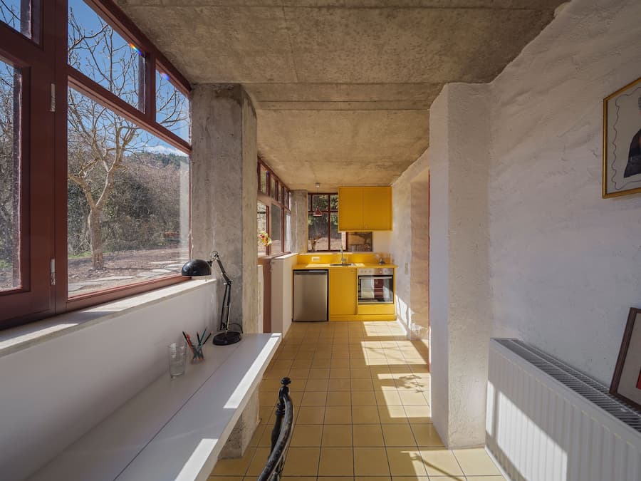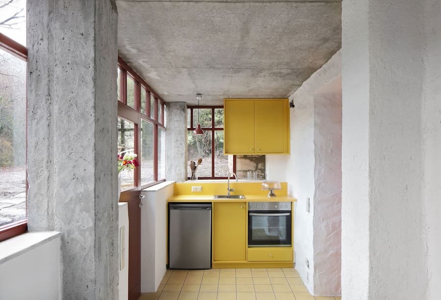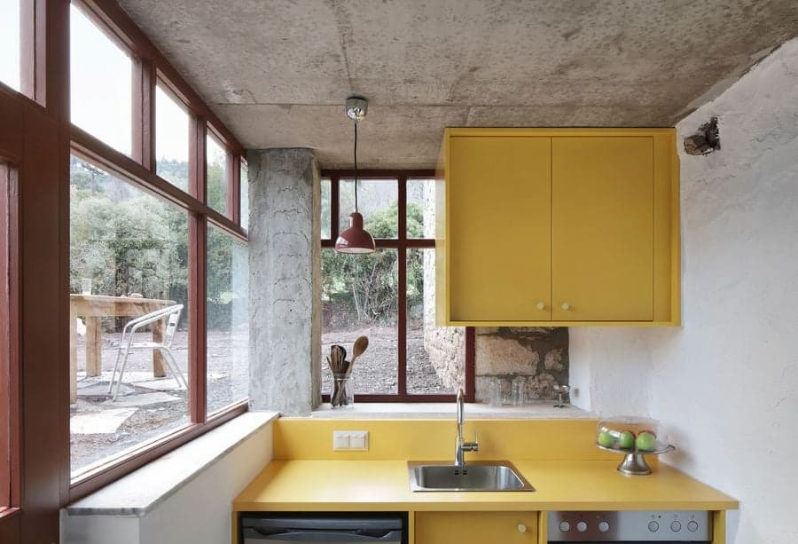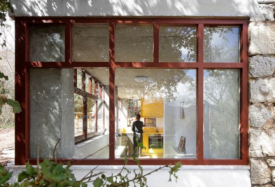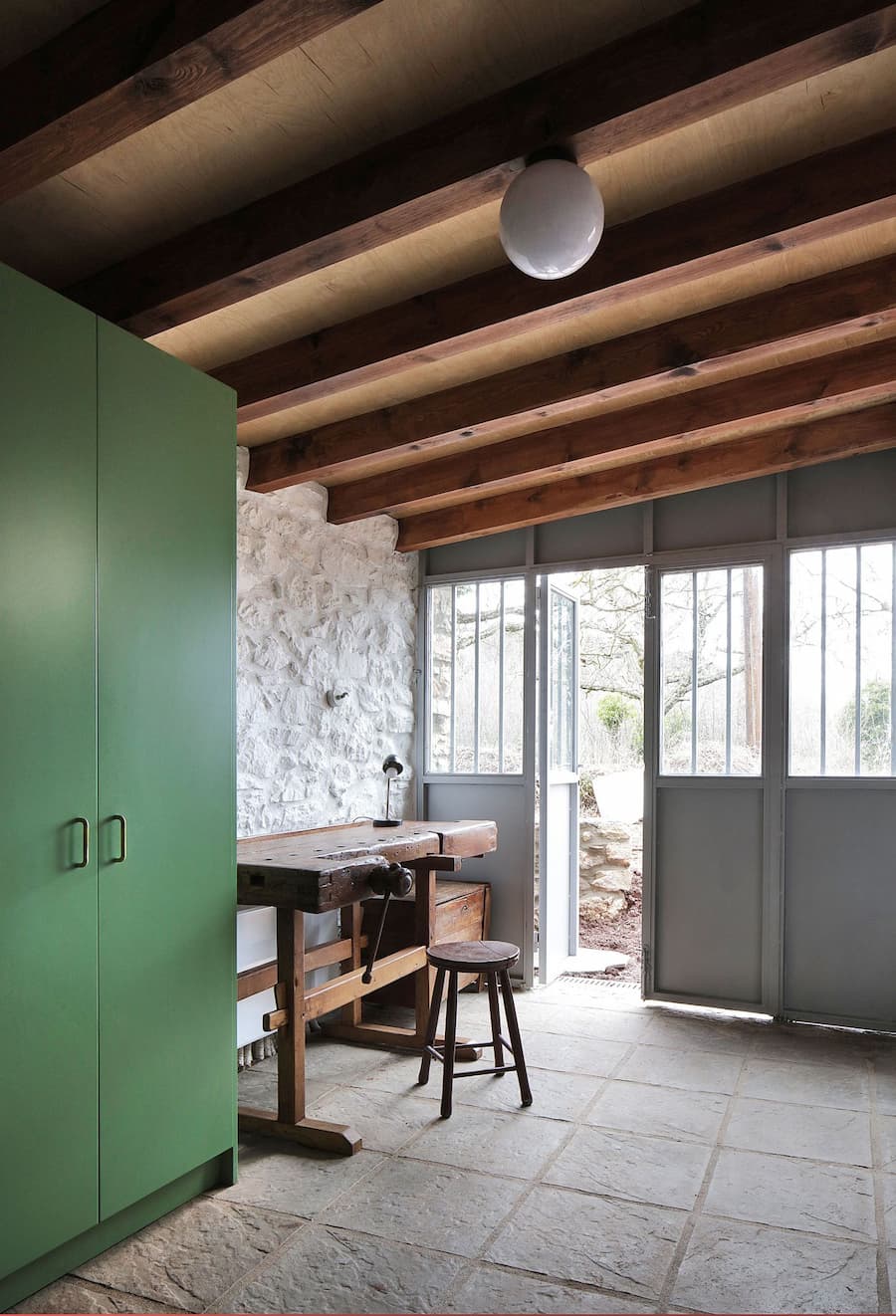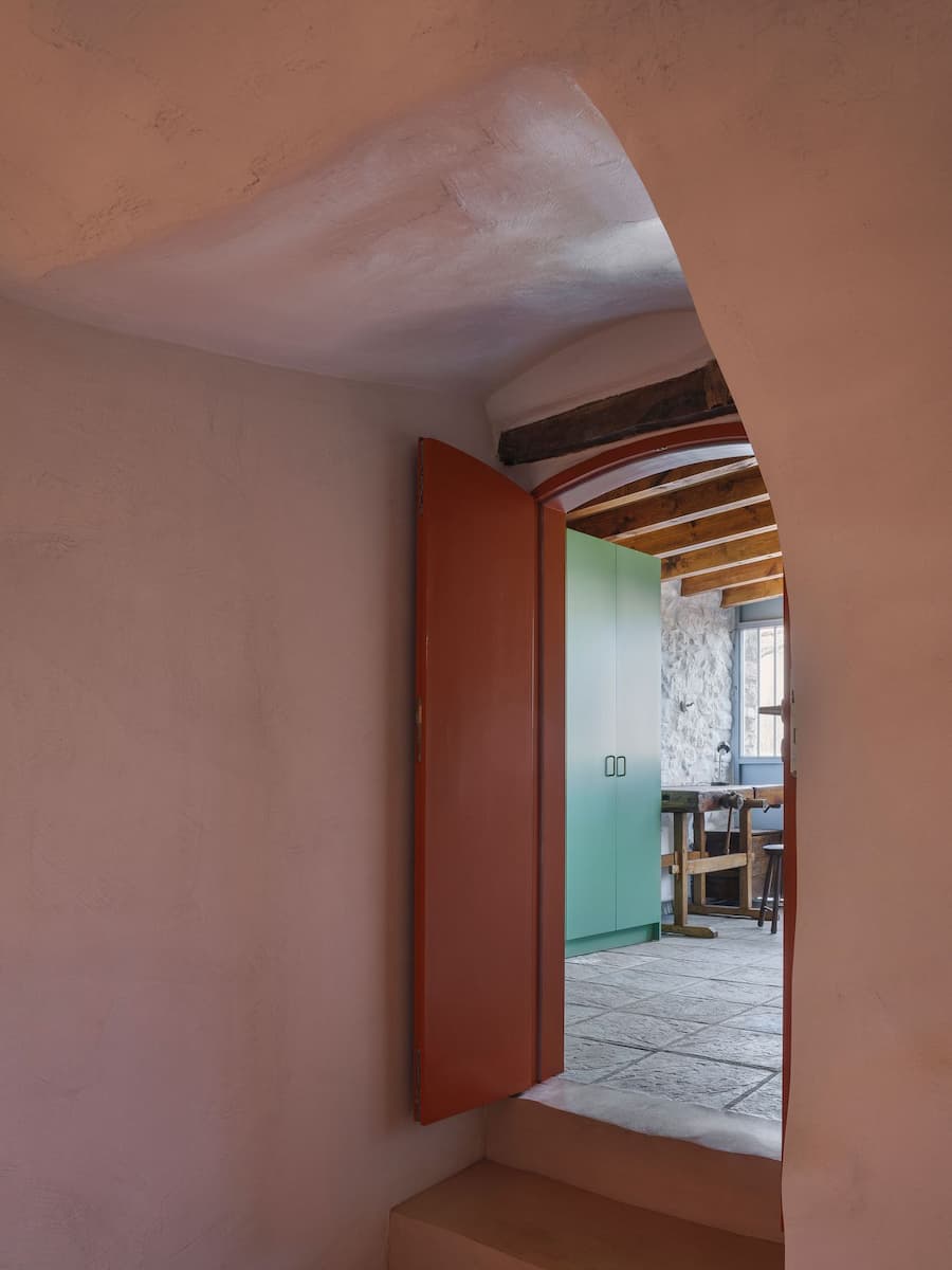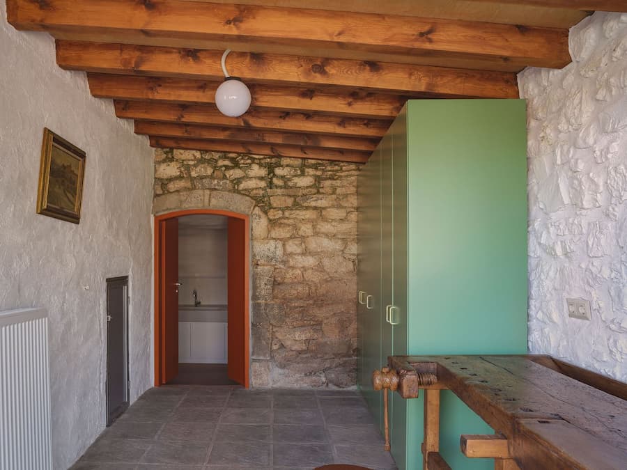 建築師將房屋內外的整修過程視為溫和的挖掘。砌牆、老舊的木樑和層層粗糙的灰泥被揭開並加固,僅在必要時引入新材料。這種對傳統敏感的改造方法的典型案例是以前的儲藏室,現在是一個工作室,其波紋鋁屋頂已被重建,並用石頭加固。它毗鄰入口門廊,不僅是對鄉村建築實踐的靜默致敬,也成為了一個雕塑般的門檻。