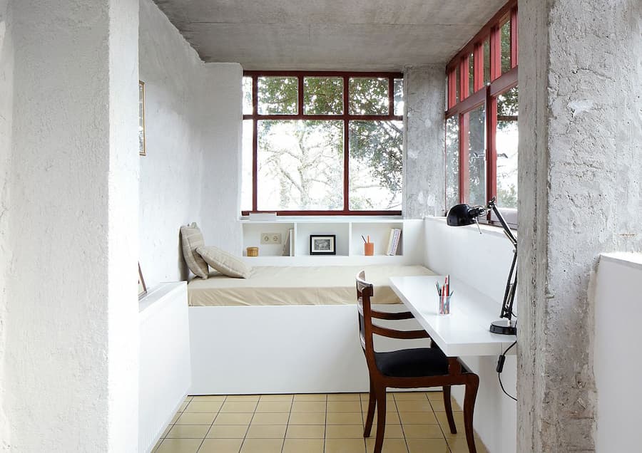 這片空間曾經是馬厩,如今已被徹底改造,兩個石砌拱頂空間被改造成舒適的壁龕臥室。床與公共區域之間以厚重的窗簾而非門隔開,每張床都放置在一個凸起的木質平台上,平台上隱藏著儲物空間和備用床墊,方便過夜。附近的木質樓梯底部兼作額外的座位和隱藏的儲物空間,而相鄰的浴室也兼作門廳,體現了建築師將多種用途融入小空間的才華。在同一層,陽台下方原本是儲藏門廊的狹窄柱狀區域已被改造成一個玻璃“liakoto”,一個集日光浴室和實用功能於一體的多功能區,配備了沙發床、小廚房和學習區。