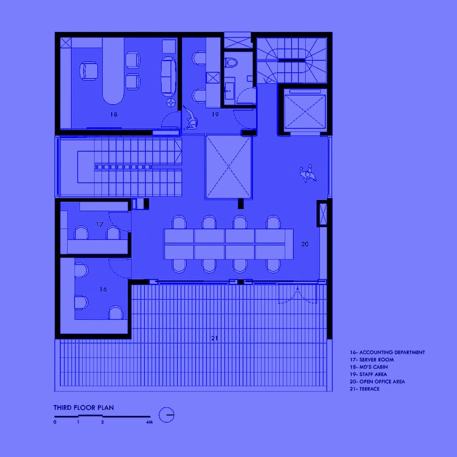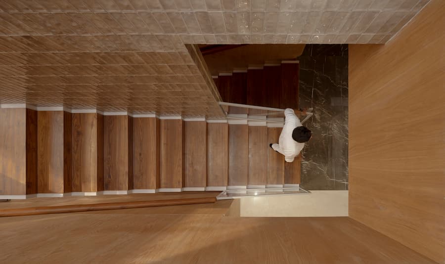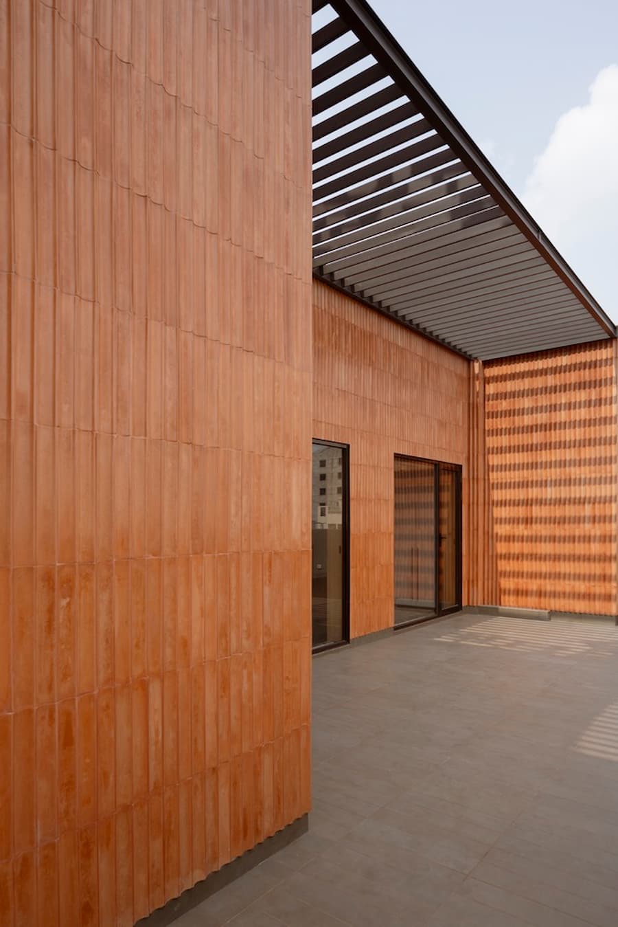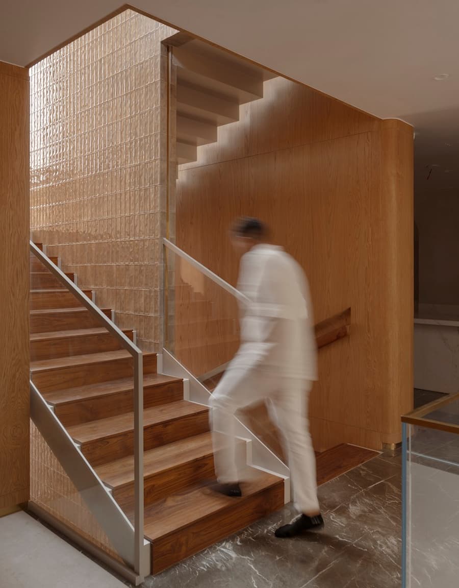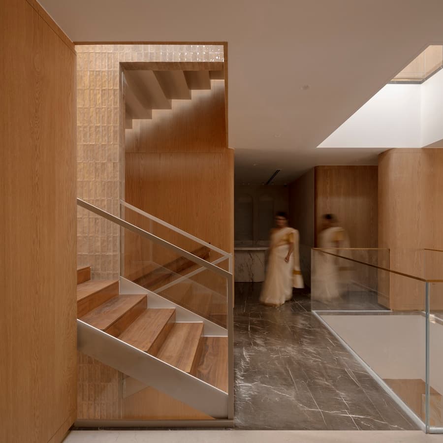 自然光成為室內空間的真正主角。一個符合印度風水原則的雙層挑空空間,透過天窗將日光引入室內深處,從而在視覺上打開了空間。建築物南側的樓梯由陶瓷玻璃磚支撐,折射和散射光線,在厚重的外部結構中營造出一種輕盈之感。 「這是為了帶來一些驚喜,」普拉奇說道,「讓建築呈現出意想不到的精緻之美。」這短暫的光輝將原本可能顯得封閉的室內空間,轉變為一個明亮而令人愉悅的環境。