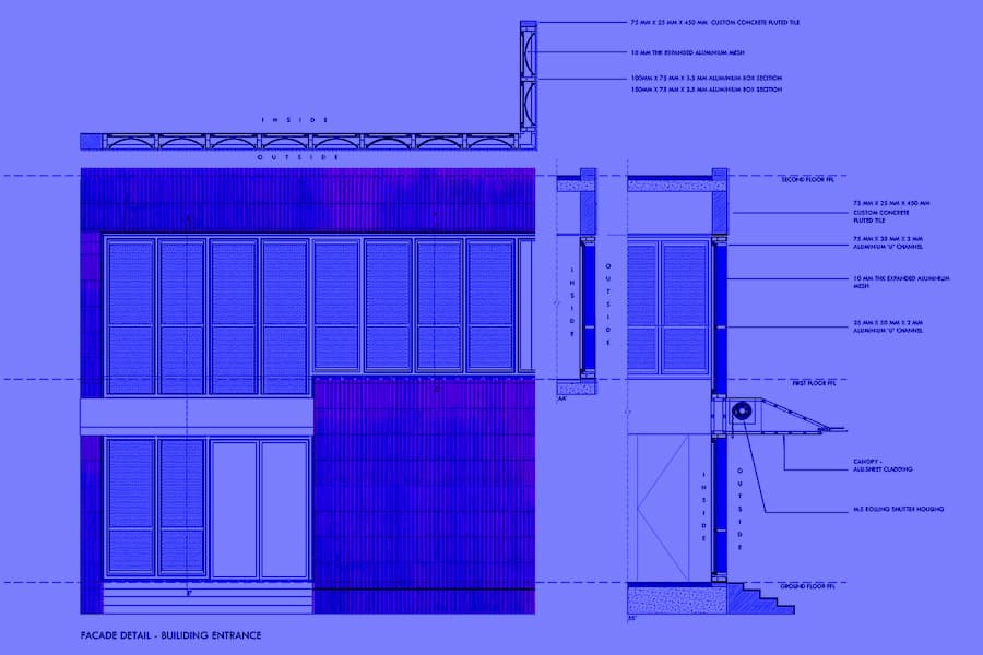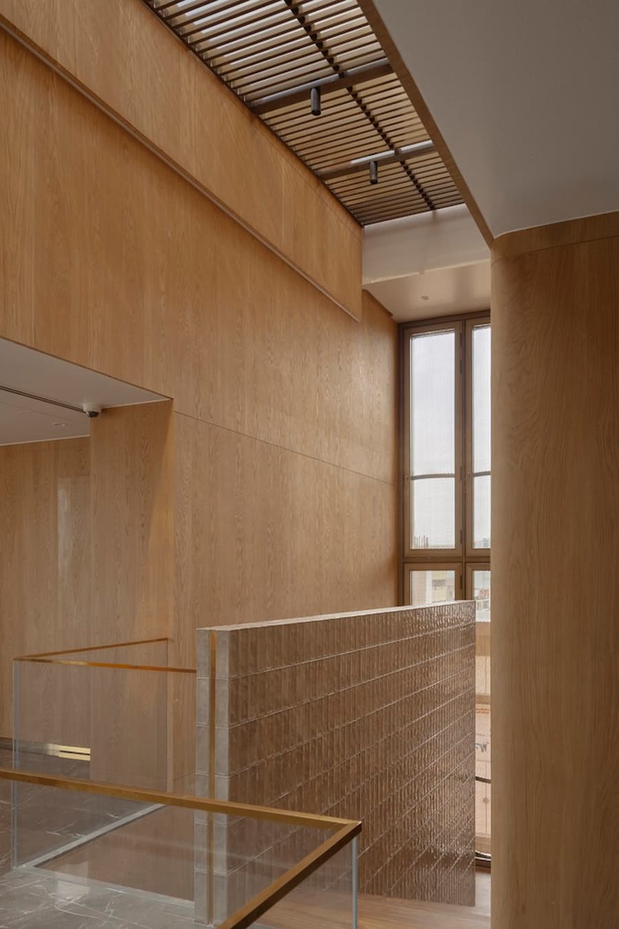 UF+O工作室的方案是打造一個既非不透明也非完全透明的立面,介於兩者之間。經過嚴謹的原型製作,最終呈現出完整的外部形態,其窗戶能夠精準地引入自然光,外立面則覆以定制澆鑄的啞光陶土色陶瓷混凝土槽。這些非正交模組以韻律般的順序重複排列,賦予建築雕塑般的質感,使其擺脫了珠寶店常見的商業光澤。 「創造一個能夠體現永恆和獨特性的建築至關重要,」Vineet 說道,「它不是一層光鮮亮麗的外衣,而是與城市融為一體的物件。」光影在槽面上的變幻賦予建築表面動態的特質,使其在一天中呈現出不同的風貌。同時,窗戶朝向北面和東面經過精心設計,既能引入自然光,又能避免室內受到眩光和熱量的侵襲。玻璃表面覆蓋著一層膨脹的波紋鋁網,增加了一層不可穿透性,同時控制了入射的陽光。