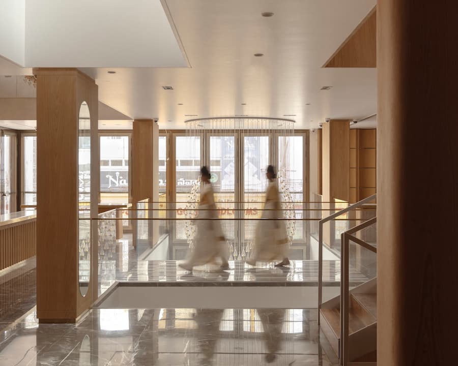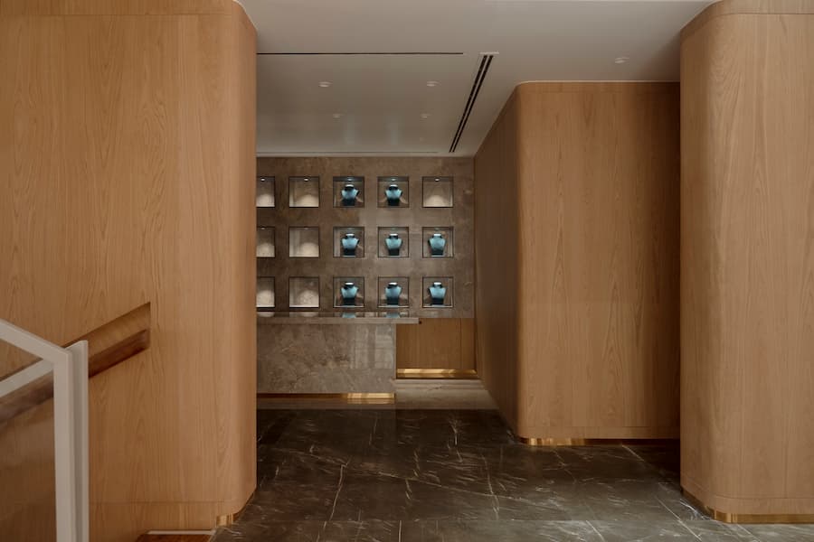 建築外觀的凹槽紋理也延伸至室內,體現在隔間、地板和展示背景中,從而將品牌的建築特色與其珠寶系列緊密相連。內外的一致性打破了建築物只是容器的固有觀念,轉而建構了一種和諧統一的空間語言,使建築與品牌融為一體。