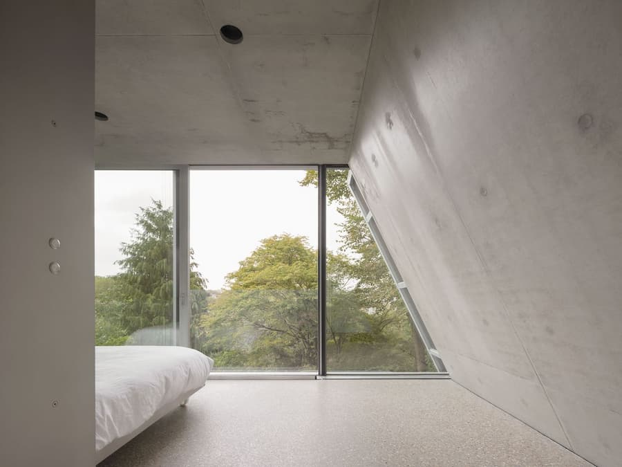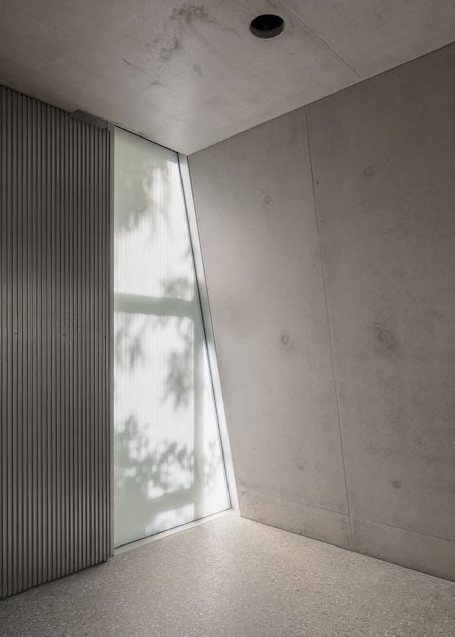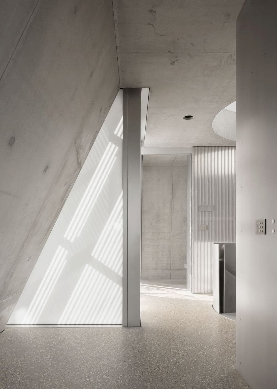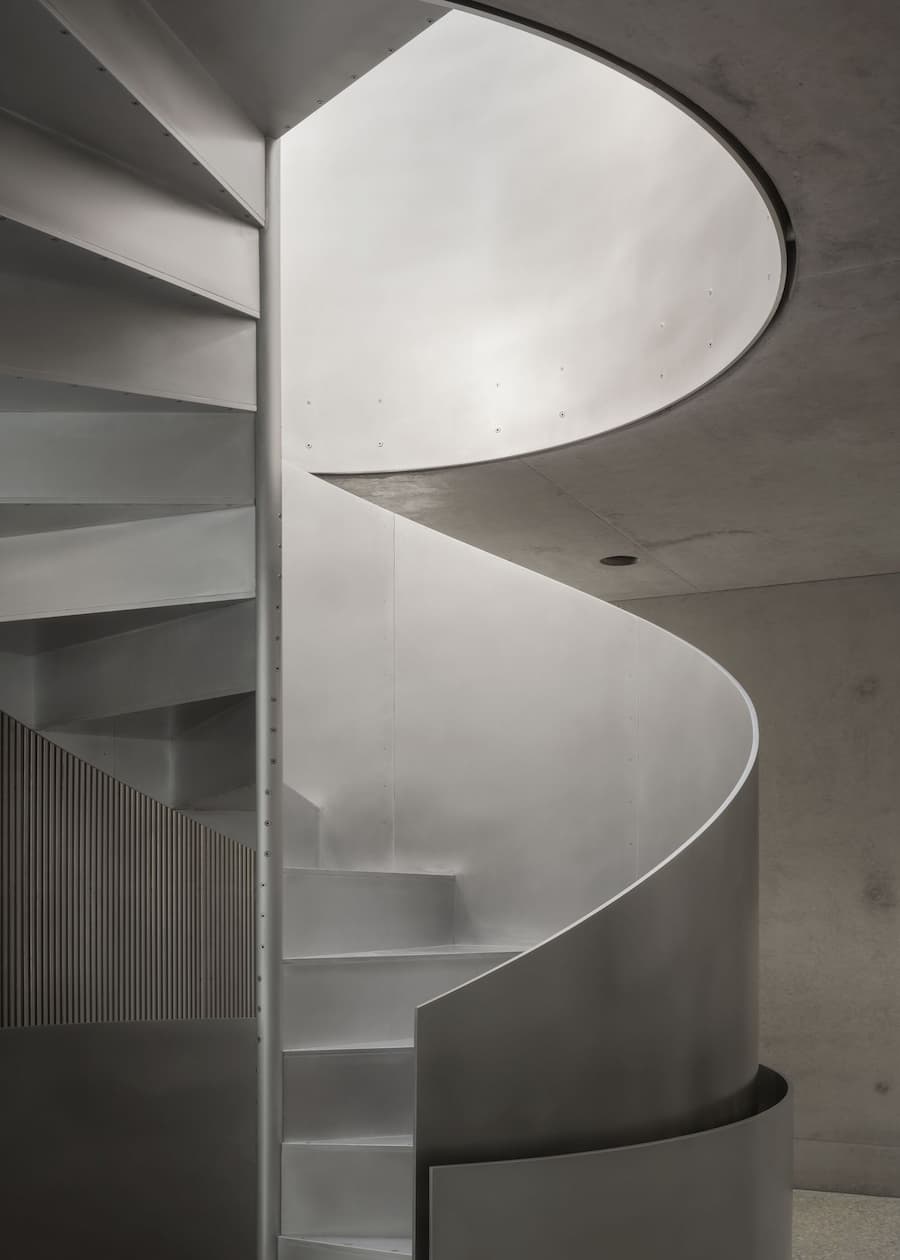 室內設計汲取了福斯特建築事務所的設計語言,以極簡主義的視角提升了工業美學。由Gianni Botsford Architects設計、在倫敦東區製造的精雕細琢的鋁製構件,點綴著混凝土外殼,從廚房櫥櫃、衣櫃到門窗和衛浴配件,為工業風注入了匠心獨具的精緻感。其中最引人注目的是連接三層主樓層的螺旋樓梯,其雕塑般的造型最終匯聚於一個兩米寬的圓形天窗之下,天窗為建築核心區域引入充足的自然光線,並實現自然通風。此外,簡約的家具和柔和的色調強化了原料的觸感,而落地玻璃窗則將樹冠和變幻的光影引入室內,柔化了空間的硬朗氛圍。