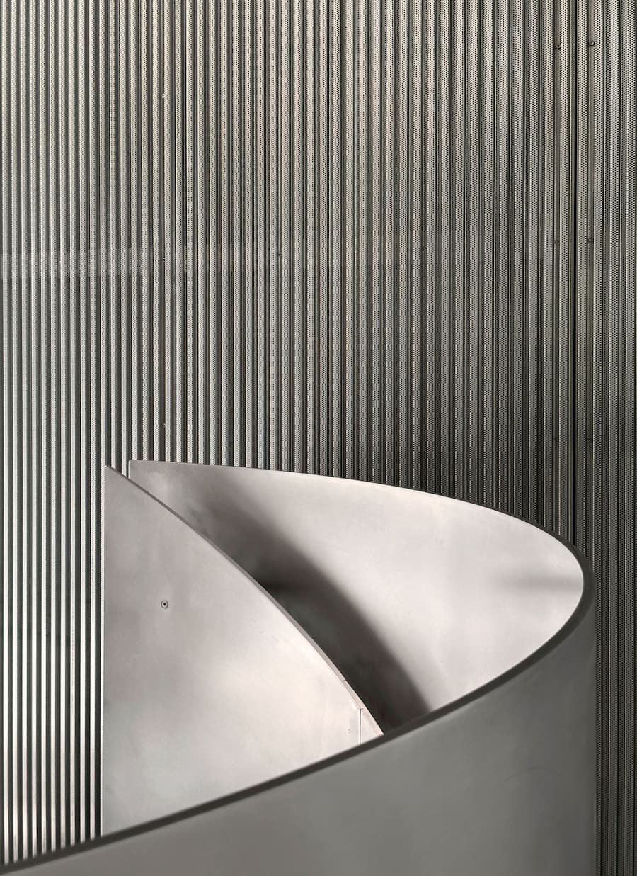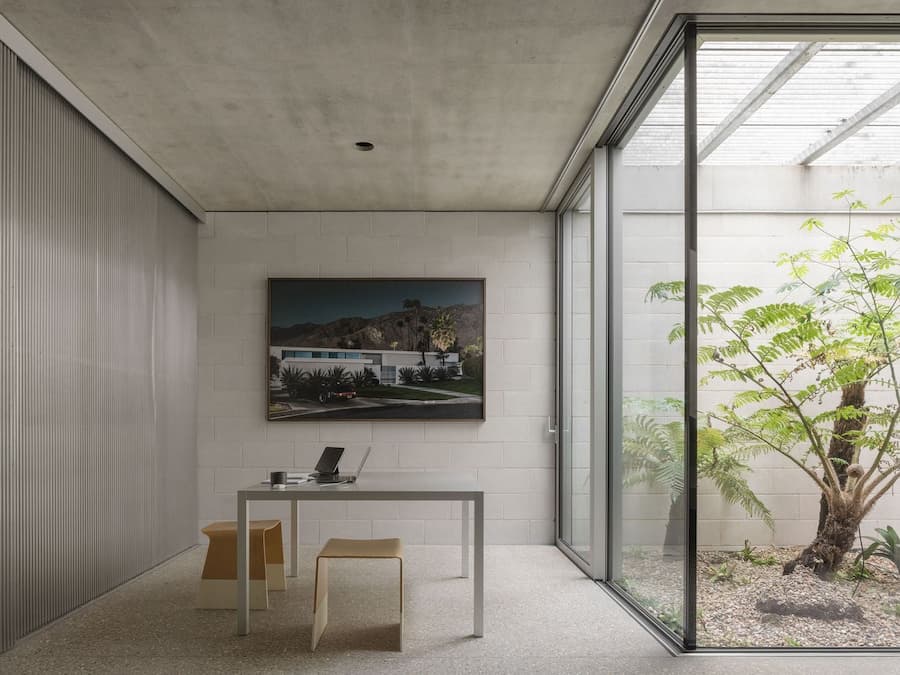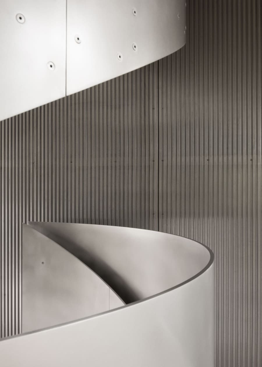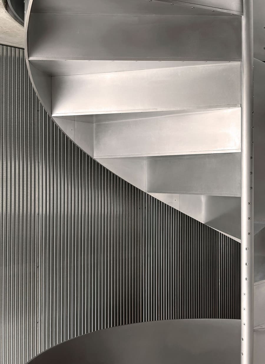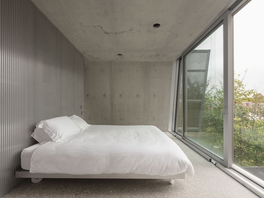 室內設計汲取了福斯特建築事務所的設計語言,以極簡主義的視角提升了工業美學。由Gianni Botsford Architects設計、在倫敦東區製造的精雕細琢的鋁製構件,點綴著混凝土外殼,從廚房櫥櫃、衣櫃到門窗和衛浴配件,為工業風注入了匠心獨具的精緻感。其中最引人注目的是連接三層主樓層的螺旋樓梯,其雕塑般的造型最終匯聚於一個兩米寬的圓形天窗之下,天窗為建築核心區域引入充足的自然光線,並實現自然通風。此外,簡約的家具和柔和的色調強化了原料的觸感,而落地玻璃窗則將樹冠和變幻的光影引入室內,柔化了空間的硬朗氛圍。