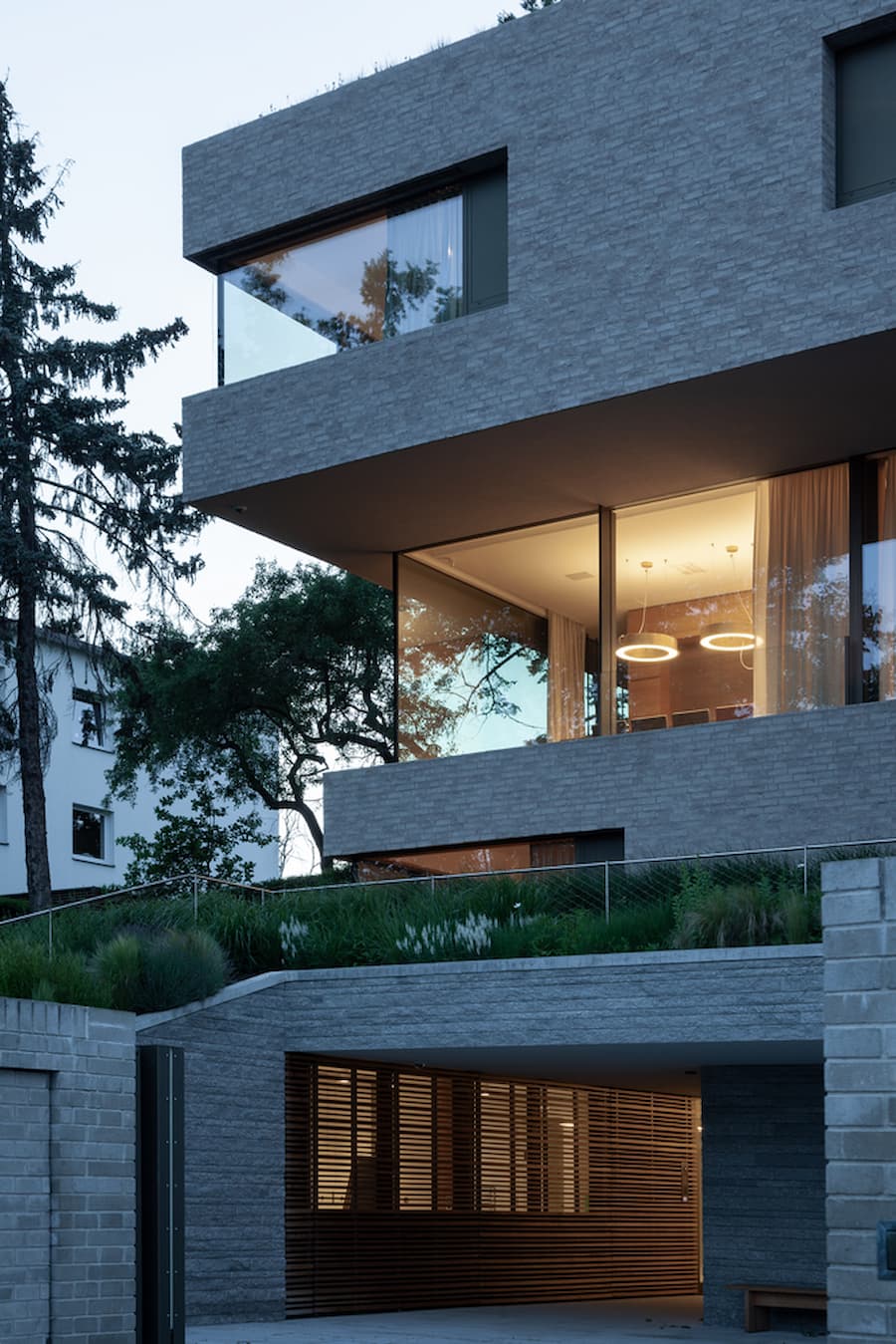 不規則磚縫的磚面運用,突顯了整個建築構圖的水平感。位於最高處的屋頂露台,配有小型全玻璃上層結構,可作為觀景台,周圍環繞著種植多年生植物的屋頂花園。實空體量的層疊、簡潔的幾何造型以及與傾斜地形的融合,共同營造出輕盈靈動的氛圍,使這座五層樓的豪宅顯得更加輕盈。