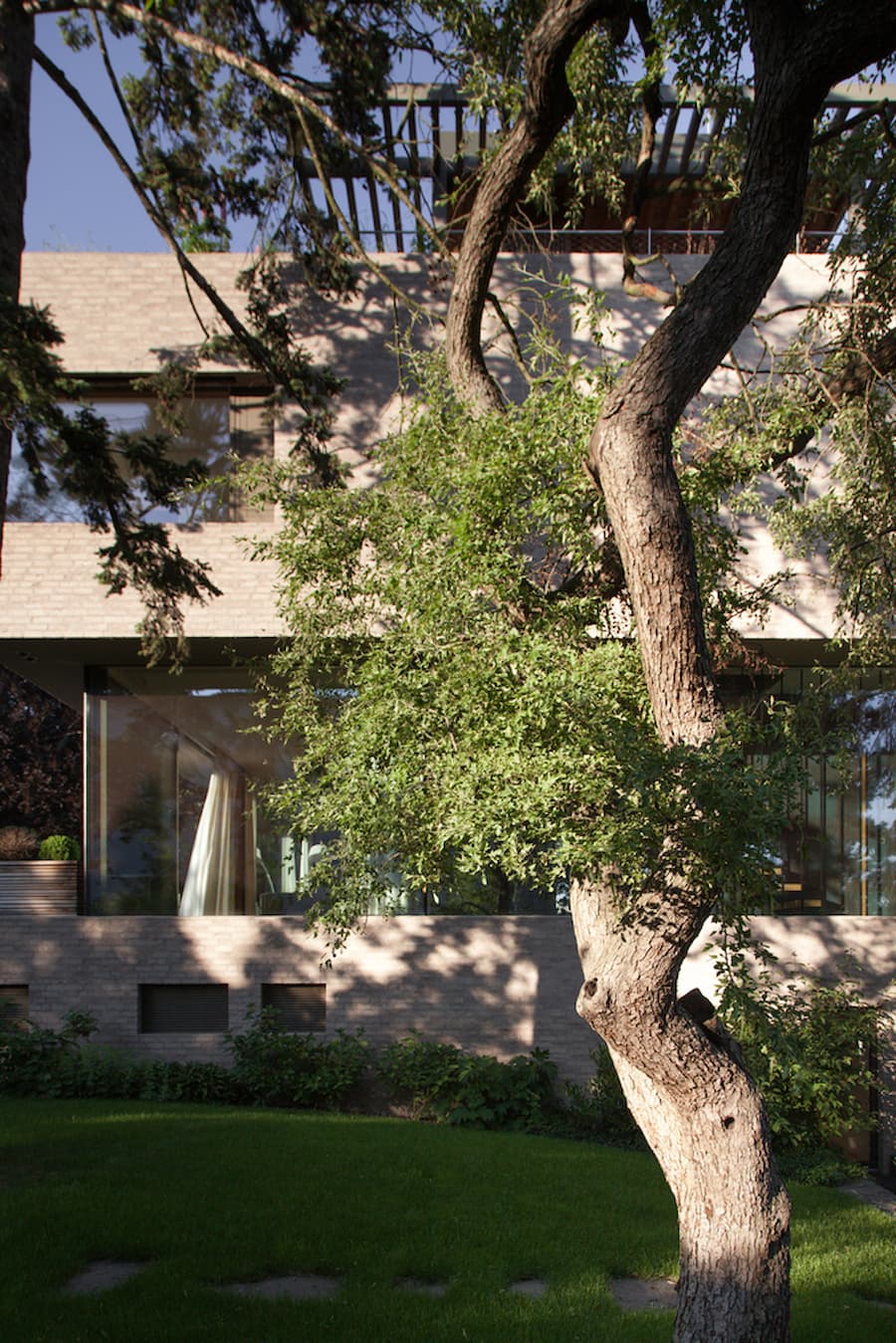 最底層——入口和停車層延伸至戶外花崗岩鋪砌的庭院——完全嵌入地形之中。二樓也部分下沉,是建築面積最大的樓層,構成房屋的磚石基座。位於其上的玻璃帷幕牆主起居空間採光充足,四周綠樹環繞。這個中央起居空間也透過兩條內部走廊與房屋的上下兩層相連。
