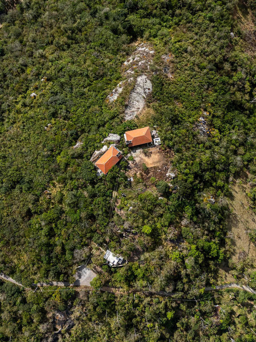 該項目的首要挑戰是在不移除任何樹木的情況下建造通往房屋的道路。因此,一條蜿蜒的小路從大門穿過土地,始終避開現有植被。在計畫興建的四套住宅中,最終建成了兩套。