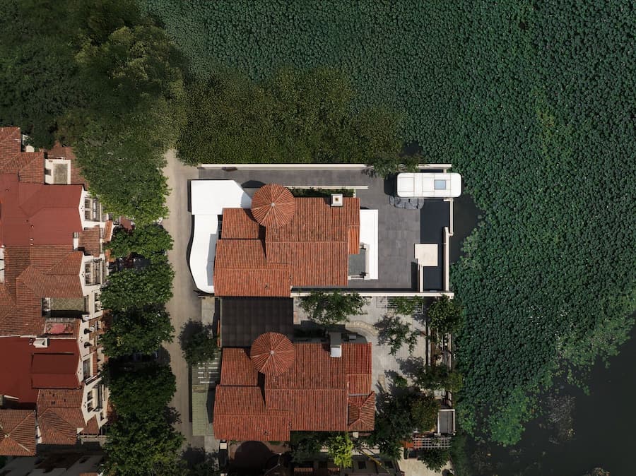 天津一棟翻新別墅,古典韻味與雕塑般的極簡主義完美融合。別墅內部進行了徹底改造,以滿足家庭的需求,但設計師保留了其外觀的古樸魅力——例如赤陶瓦屋頂、拱形窗戶和童話般的塔樓——並以一種靜謐的方式與之對話。最引人注目的改動出現在別墅正面:波浪形的頂棚如同懸浮的絲帶般懸於車道上方,其流暢的造型既呼應了主人對汽車的熱愛,又像徵著住宅的全新面貌。頂棚旁是一個極簡的白色盒子,內設車庫;別墅後方,一座獨立的、宛如太空艙般的涼亭,則成為主人父親的湖畔休憩之所,他喜歡在這裡垂釣,也喜歡與朋友們舉辦深夜聚會。這些新增部分既不喧賓奪主,也不遮蔽原有風貌,而是為別墅的懷舊氣質增添了一抹現代氣息。