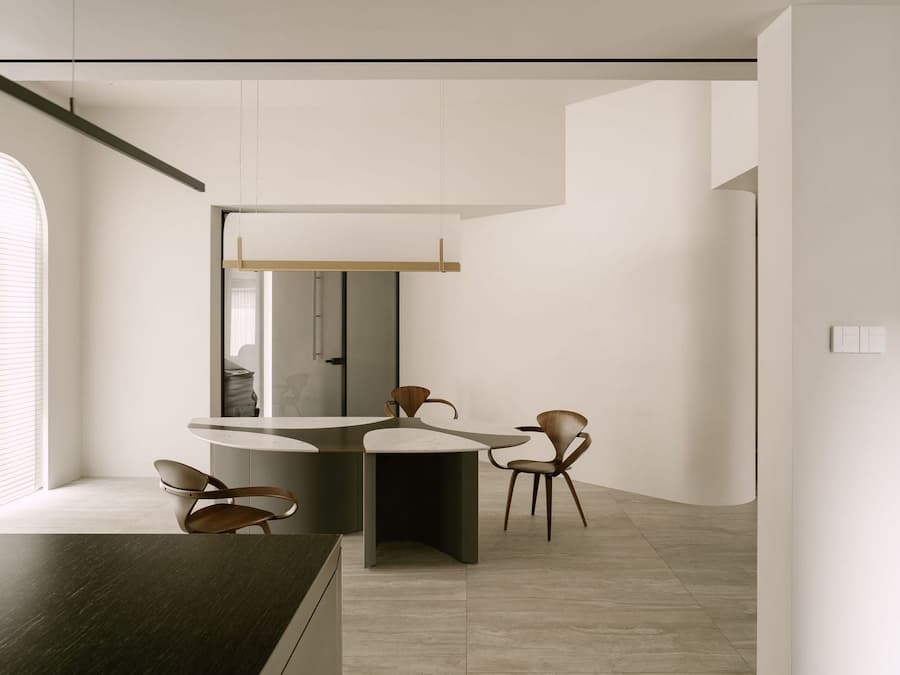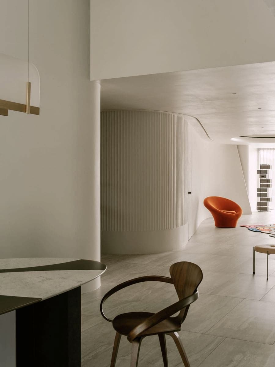 流暢的設計語言使一樓的開放式起居和用餐區以韻律般的節奏展開,各種現代和復古家具的巧妙融合呼應了房屋流暢的幾何線條。在起居區,一張造型獨特的沙發成為空間的視覺焦點,周圍環繞著郭海昌 (Kwok Hoi Chan)設計的兩把 20 世紀 70 年代的禪意休閒椅,以及皮埃爾·保蘭(Pierre Paulin ) 於1963 年設計的標誌性蘑菇椅(血橙色),為整棟住宅增添了一抹亮色。