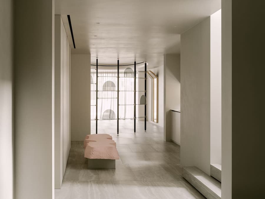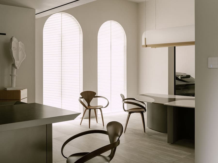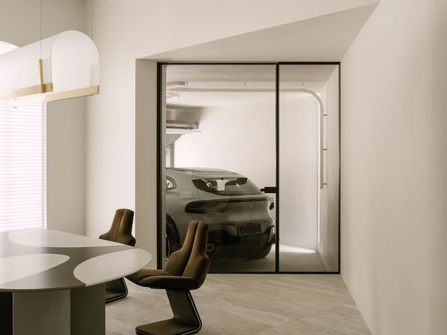 室內則呈現出截然不同的景象。曾經繁複的裝飾風格如今已轉變為簡約精緻的極簡主義空間,流暢的線條、質感豐富的表面和單色調的運用,共同營造出優雅的氛圍。為了呼應屋主對汽車的熱愛,設計師從汽車空氣動力學中汲取靈感,使每一面牆、每個天花板、每一件內置家具都擁有連貫統一的造型。蜿蜒的隔間、圓潤的邊角和弧形的艙壁模糊了房間之間的界限,營造出動態和流動性,而拱形開口和雕塑般的家具則進一步強化了空間的韻律感。