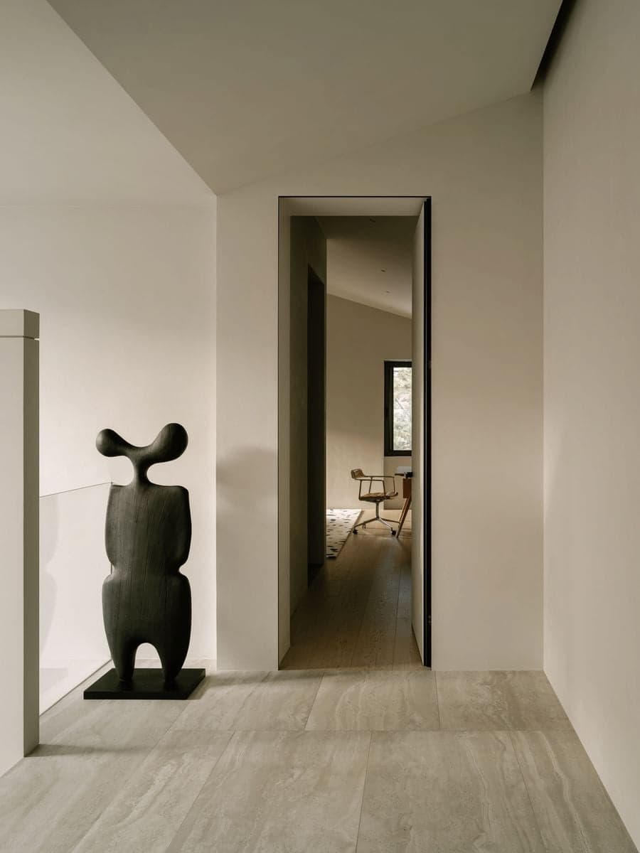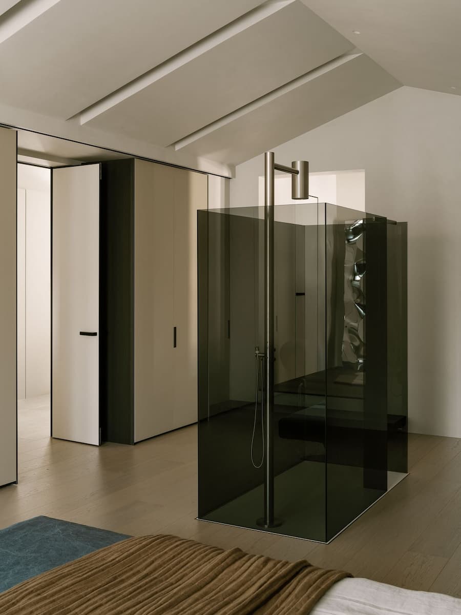 整體色調刻意克制,卻不失觸感。微水泥表面賦予空間柔和的歲月痕跡,同時又足夠堅固,能夠承受孩子們天馬行空的玩耍。一層鋪設的大尺寸石板流暢地延伸至地面,其細微的紋理與透過大面積玻璃窗灑入室內的光線交相輝映。二層私人空間則鋪設木地板,增添溫暖氣息,而同樣採用微水泥塗層的衣櫃則確保了視覺上的連貫性。在光滑拋光的表面映襯下,幾根裸露的混凝土樑柱格外醒目,進一步豐富了空間的觸感。