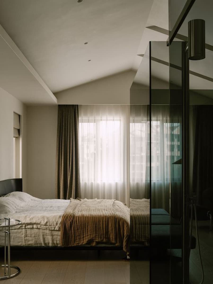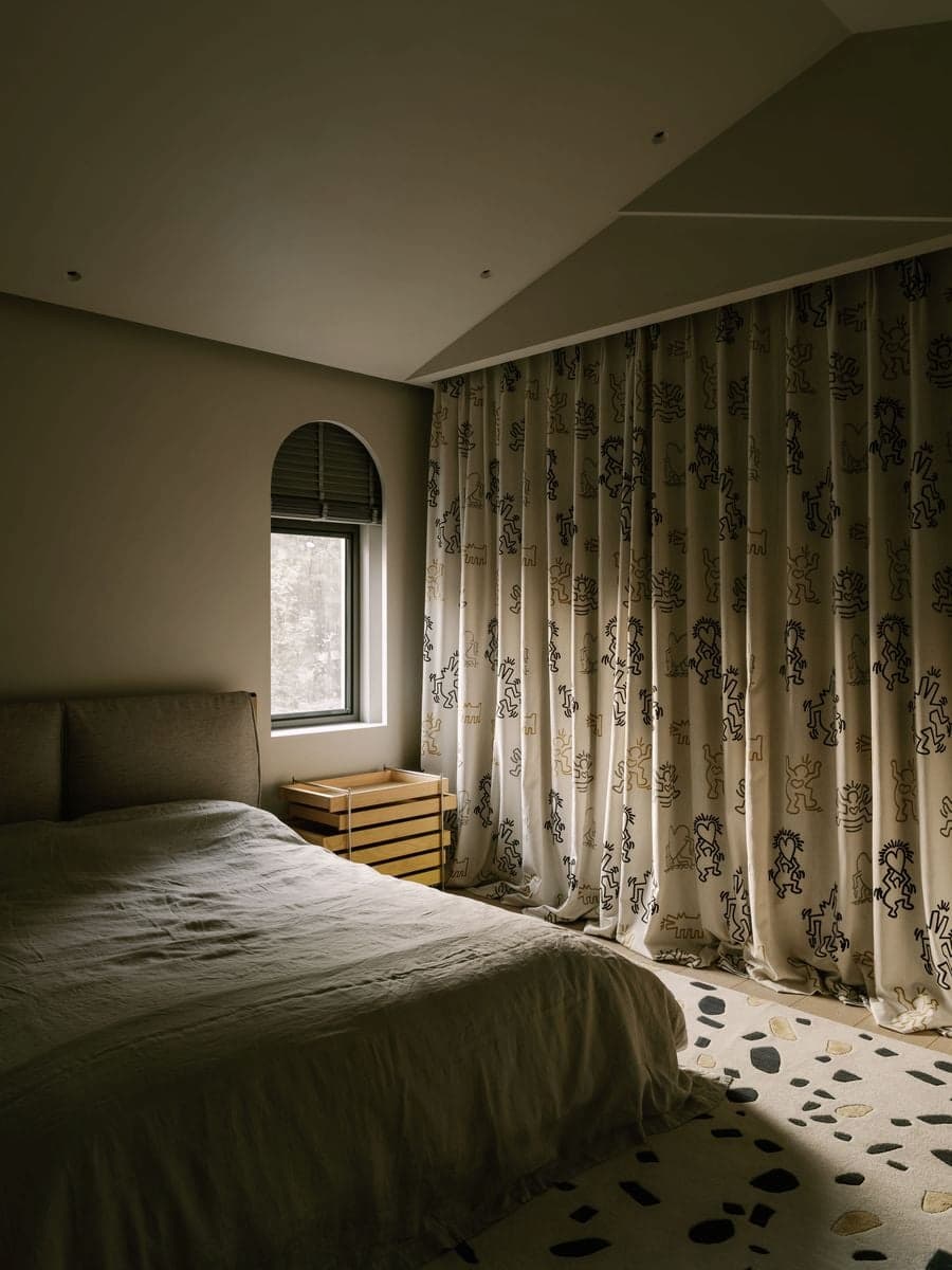 樓上設有三間臥室,其中包括一間寬敞的主臥套房。套房內獨立的玻璃淋浴間營造出一種儀式般的寧靜氛圍,下沉式浴缸則進一步提升了主浴室的SPA般舒適感。與之形成鮮明對比的是,其中一間兒童房則兼顧了實用性和趣味性,鋪設了水磨石地板,並搭配了花卉圖案的窗簾。
