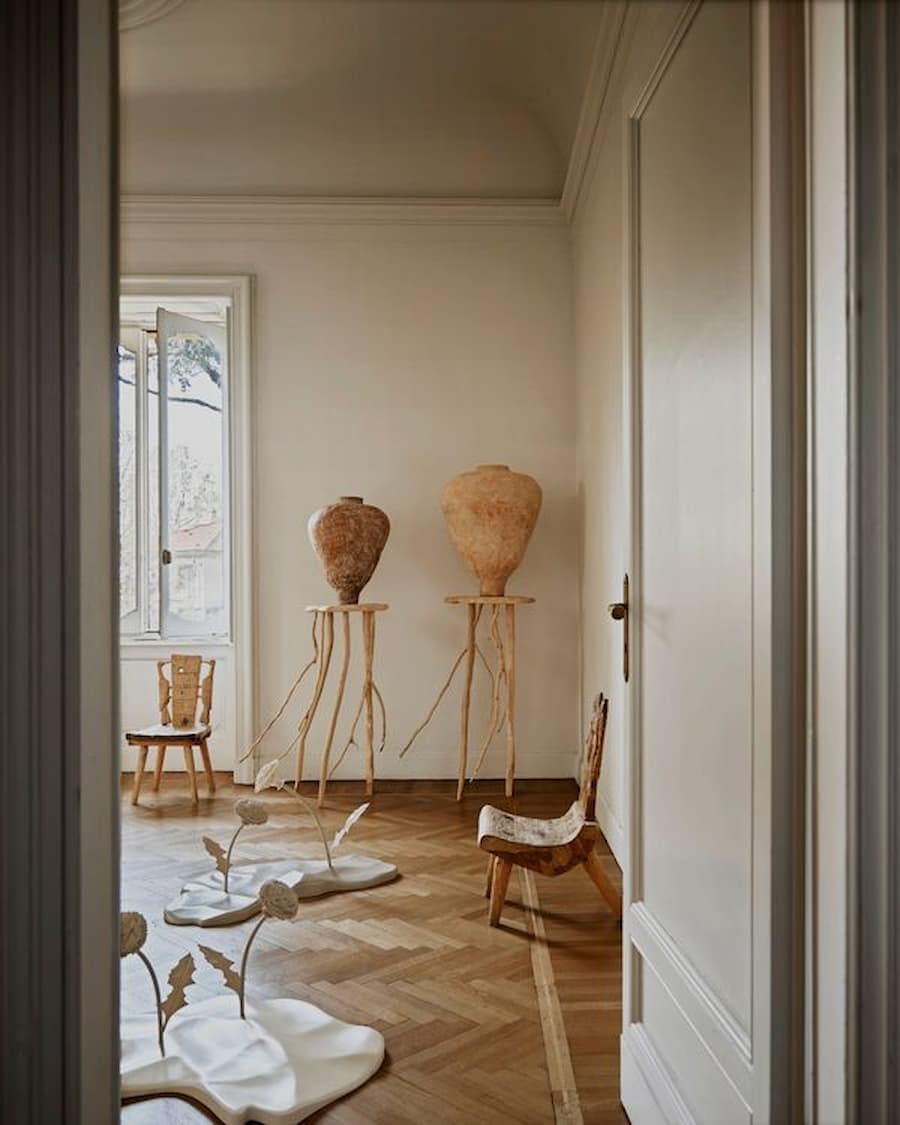此次裝置藝術是Nilufar雄心勃勃的五幕展覽「Repertorio」的一部分,橫跨Nilufar Depot和Nilufar Via della Spiga兩個空間。在後者,我們特別關注了「Ex Terrā」展覽,該展覽探索了人類對自然形態和循環的持久迷戀。其中一件令我們印象深刻的作品是Maximilian Marchesani的“Famiglia”吊燈,它由在米蘭帕萊斯特羅花園收集的扭曲樹枝和鸚鵡羽毛製成,是對城市環境中自然遷徙和變異的細膩而憂鬱的沉思。
