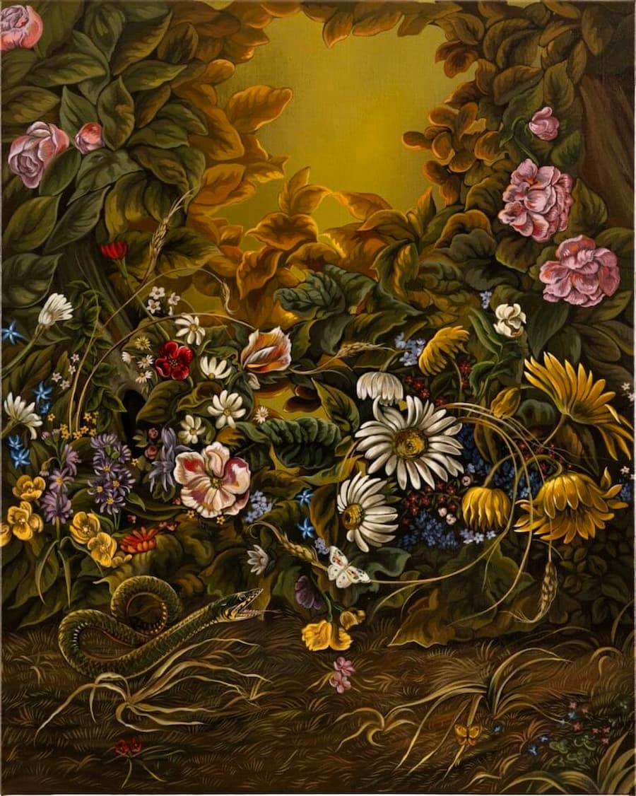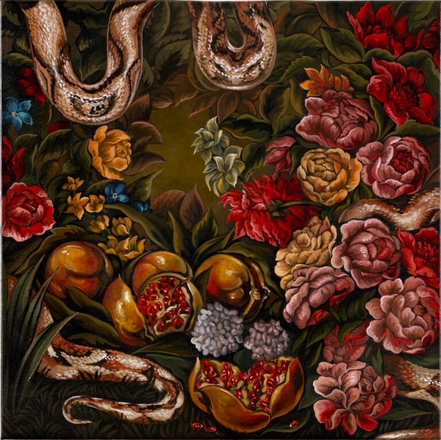 薩布麗娜·博克勒的動態畫作總給人一種略微不安的感覺,儘管Sabrina Bockler 的怪誕畫作中,富裕階層的風俗場景爆發成混亂,有時需要仔細琢磨才能找到原因。乍看之下,餐桌佈置得十分豐盛,或是繁花似錦,色彩絢麗。但仔細觀察後,你會發現一隻雙頭鵝,一桌食物正被貓狗糟蹋,或是那種令人不安的被注視的感覺。